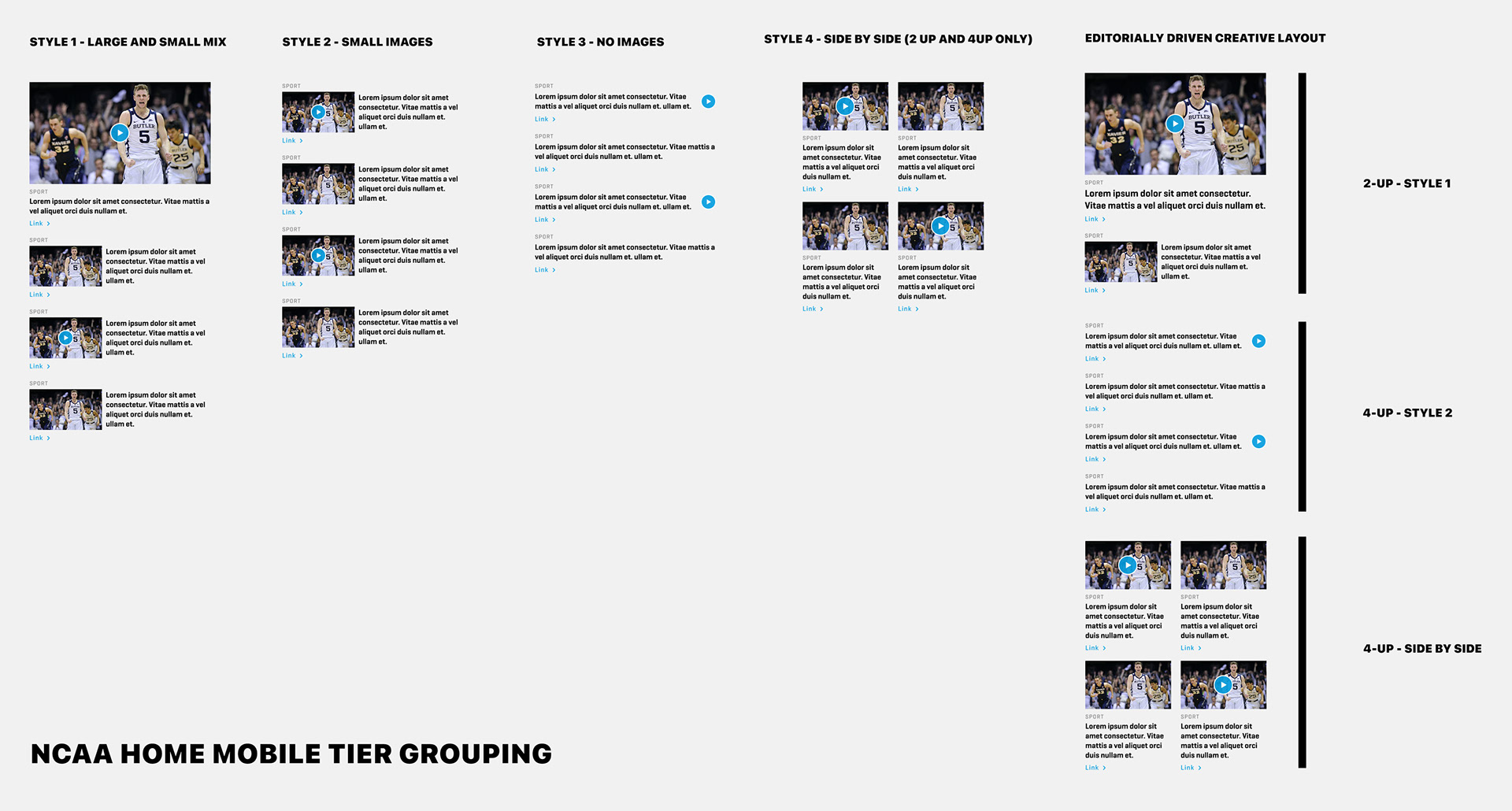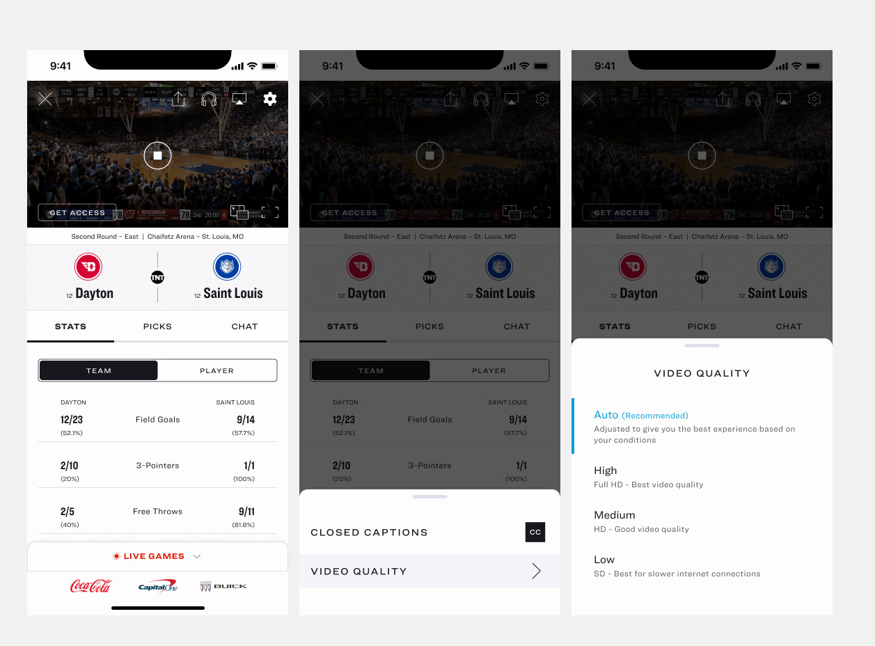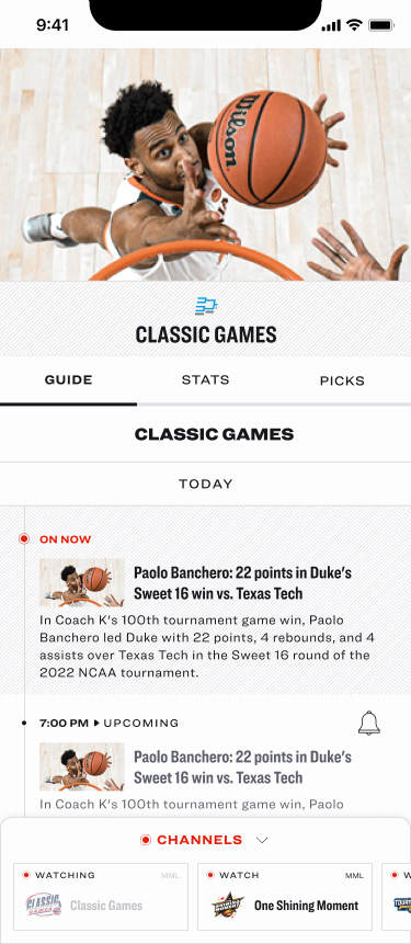 A selection of work across March Madness Live and NCAA, including both in-market features and exploratory designs focused on extending the brand system.
